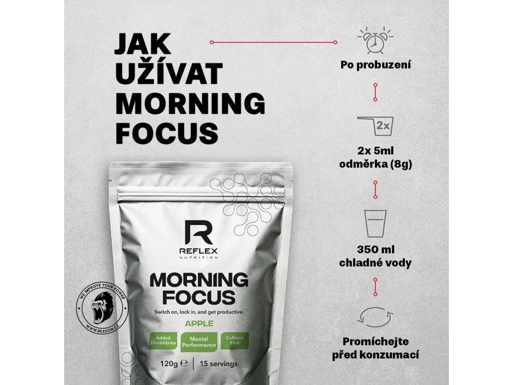 Morning Focus neobsahuje kofein, ale je vhodný pro použití spolu s ranní kávou. Je určený pro každého, kdo chce začít den soustředěně, kdo se chce nastartovat a být produktivní bez závislosti na kofeinu, pro všechny, kteří potřebují překonat ranní mlhu.