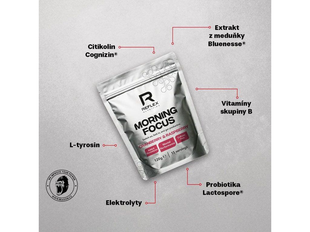 Citikolin Cognizin® (CDP cholin) pomáhá funkci mozku, vlastnosti této látky souvisí s činností neurotransmiterů, extrakt z meduňky Bluenesse® pomáhá soustředění a tlumí roztěkanost z kofeinu, a L-tyrosin výrazně posiluje soustředění. Přidaný hořčík, draslík a vitamíny skupiny B podporují nervový systém a energetický metabolismus. Probiotika a vláknina pomohou vstřebat živiny ze snídaně.